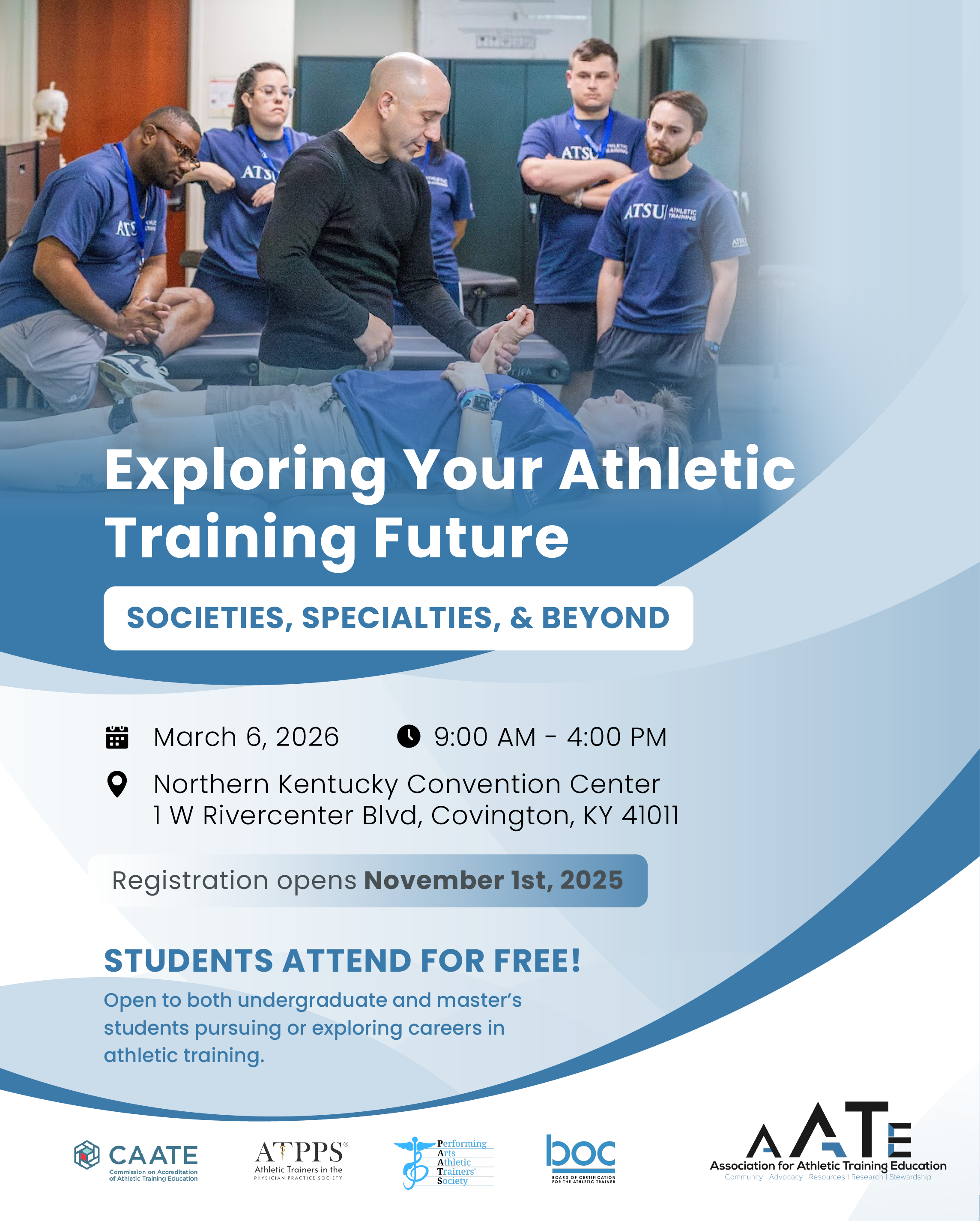 Catch the CAATE at Student Discovery Day in Cincinnati, OH, on March 6, 2026! In collaboration with AATE, ATPPS, BOC, and the PAATS, we invite students to attend this free interactive experience. Get introduced to the breadth of athletic training careers and specialties through select conference sessions, panel discussions, and networking opportunities. Open to both undergraduate and master's students pursuing or exploring careers in athletic training.